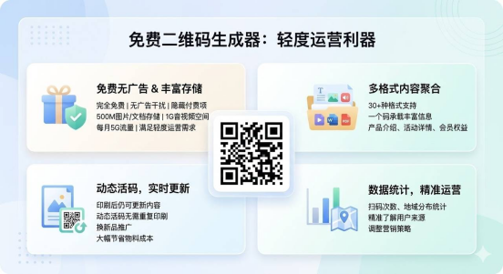做活动、推新品,二维码是中小商家的高频营销工具,但不少商家总被二维码生成的问题卡壳。要么导出高清格式要付年卡费,要么免费版满是广告拖慢转化,实在头疼。 比如想做会员活动二维码,找的工具导出高清PNG要付年卡费,临时凑合用免费版,结果扫出来先跳半分钟广告,顾客直接没了耐心。 换个工具,免费版只能导出模糊的JPG,印在门店海报上扫半天没反应,白忙活一场。 这些隐形的成本和效率损耗,对本就预算有限的中小商家来说,实在是没必要的负担,也让不少人对二维码制作工具的选择犯了难。