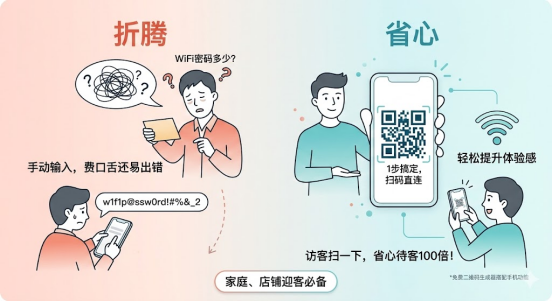 家里来客、店铺接客,总被追着问“WiFi密码多少”?翻备忘录、报密码费口舌,客人手动输入还总出错,实在太折腾!