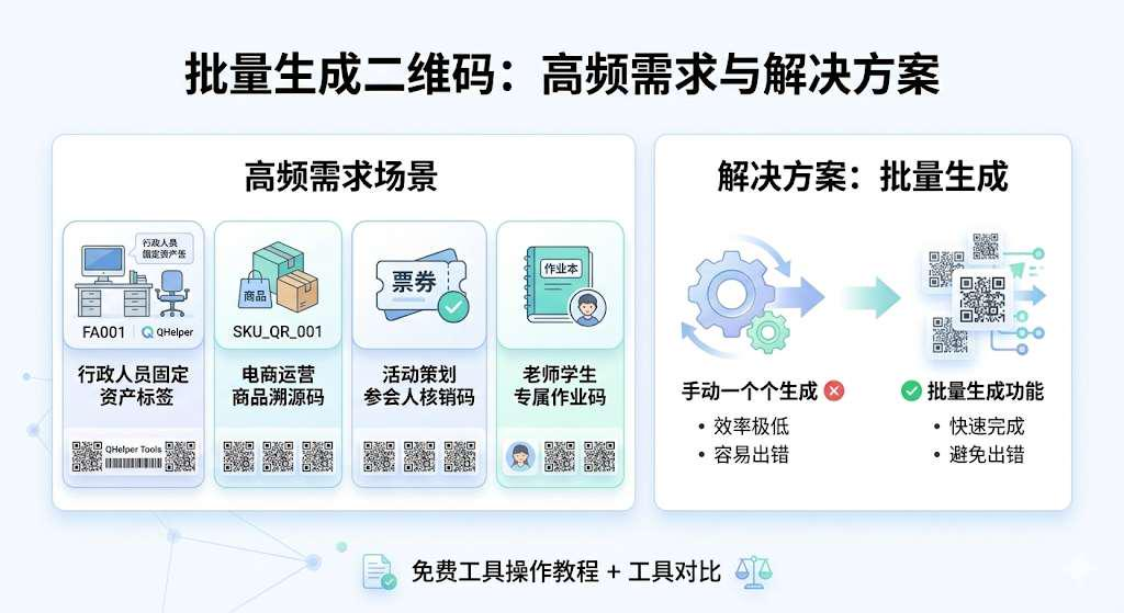 在日常工作中,批量生成二维码是很多岗位的高频需求:行政人员需要为公司所有固定资产生成标签,电商运营需要为每件商品生成溯源码,活动策划需要为每个参会人生成核销码,老师需要为每个学生生成专属的作业码。如果一个个手动生成,不仅效率极低,还容易出错,批量生成功能就成了刚需。今天我们就给大家讲解怎么用免费二维码生成工具快速批量生成二维码,还有市面主流工具的对比。批量生成二维码的核心需求和市面工具现状不同行业